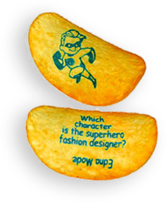 當團隊腦力激盪要如何才能讓零食變得更有趣,有人建議可以把時下流行的圖案印在洋芋片上。大家都認為點子很棒,但做起來卻十分具挑戰性,必須趁洋芋片剛炸好,濕度及溫度都還很高時就噴印圖案或文字,而且即使能夠每分鐘噴印好幾萬片洋芋片,也得確保每一片都是清晰的圖案。