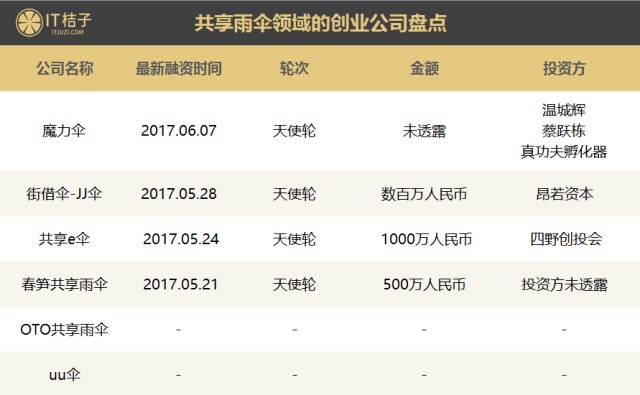 目前,IT桔子熱門專輯裡面就收集整理了6家共享雨傘領域的新創公司,其中有 4 家已經拿到投資。