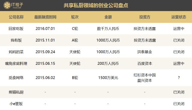 主打私廚共享的新創公司在2015年O2O概念比較紅的時候,有好幾家公司都拿到了融資,如:回家吃飯、覓食網絡、媽媽的菜、我有飯等。但根據IT桔子收錄的信息顯示,媽媽的菜、我有飯、熊貓私廚以及小e管飯都已經關閉,而覓食網絡的最新融資時間距離現在已有兩年時間,且官網已經打不開,可能也停止運營了。