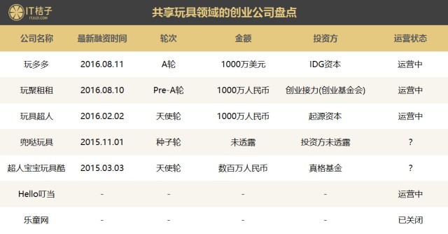 在中國模仿Pley、做玩具共享的新創公司也不少。上面是根據IT桔子的數據庫整理的部分共享玩具領域的新創公司,其中融資額度最大的是玩多多,當然也有活得不如意的公司,像樂童網已經關閉,另外還有兜噠玩具和超人寶寶的官網已經打不開,也可能出現了問題。