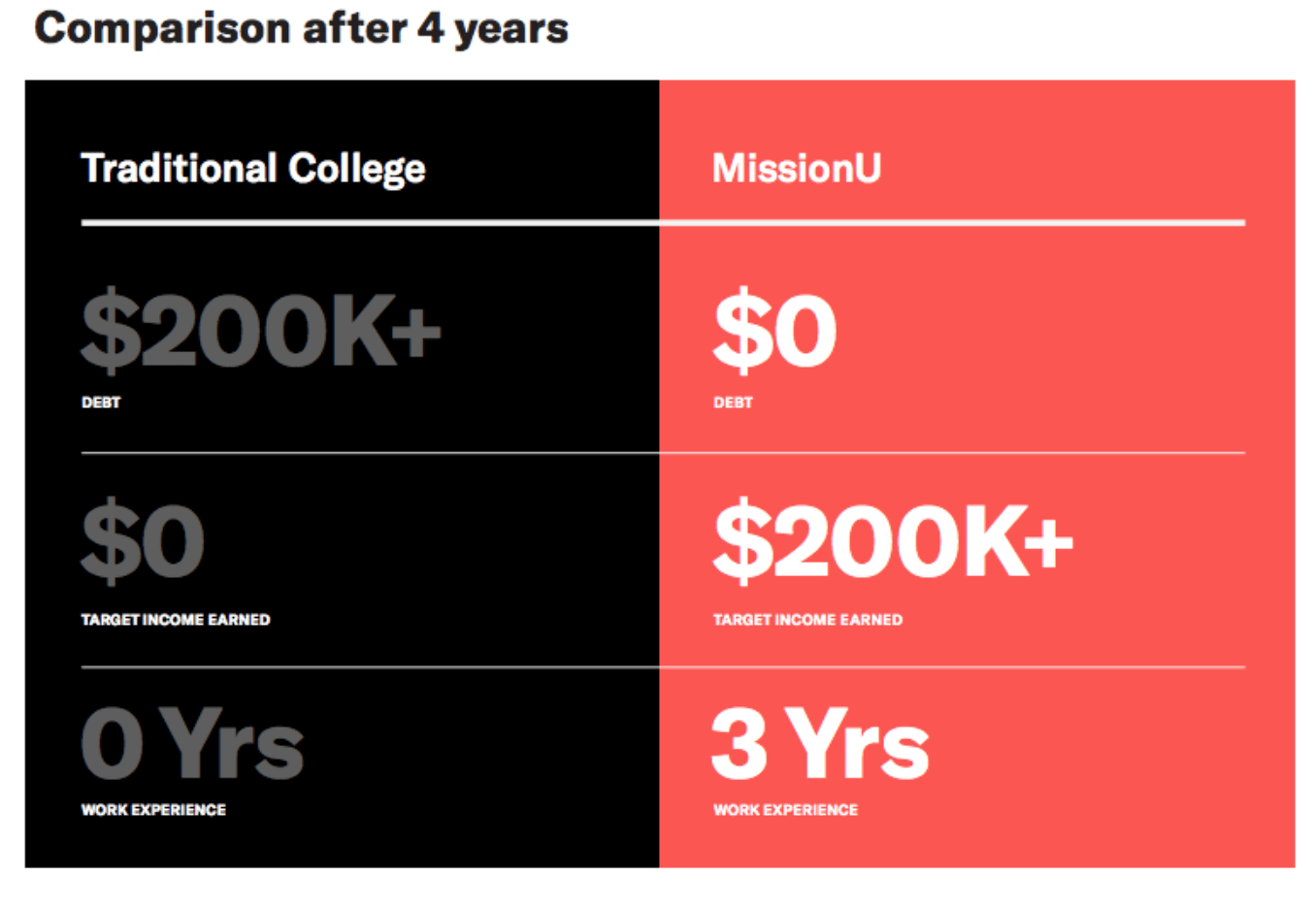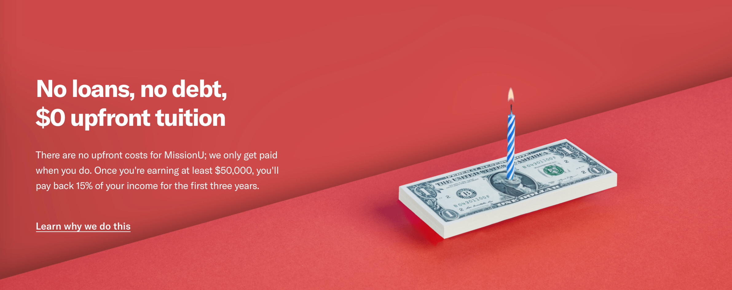 面對學費高漲,美國有80%以上的大學生因為付不起學費而無法順利唸完4年大學,而没有大學文憑也意味著他們不太容易找到待遇好的工作。因此 MissionU 讓年青人接受一年的教育訓練,訓練期間不需要貸款付學費,只要承諾學成就業後的年薪如果有達到5萬美元,則前三年每年提撥薪資的15%給 MissionU。這樣的方案讓學員在上課時没有財務壓力,因此可以專注在學業上。這同時讓他們能夠學得更精,提升找到好的工作的機會,而 MissionU 也可以收到錢,彼此互惠創造雙贏。