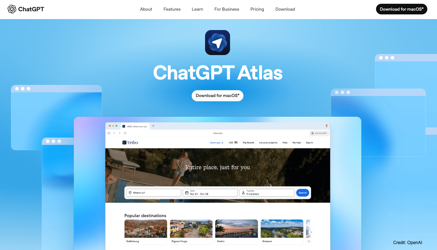 10月21日,OpenAI發表網路瀏覽器「ChatGPT Atlas」。與老字號Google Chrome、微軟Edge,以及新秀Perplexity Comet等瀏覽器競爭。